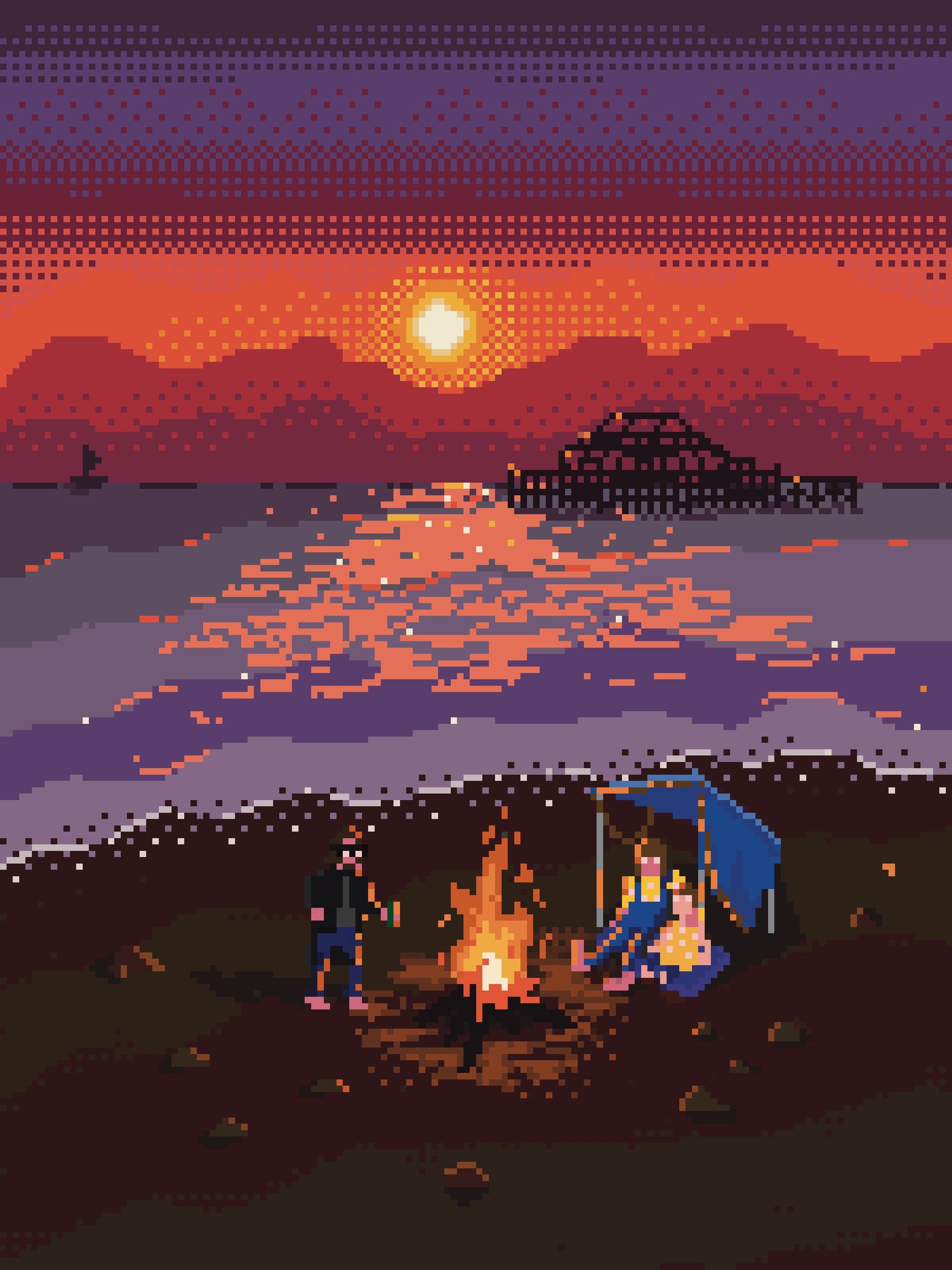 This was my first attempt at pixel art, and I used my home-away-from-home of Brighton as a back drop. I love the skeletal West Pier and how it's twinkling against the sunset. The people on the beach are some good pals, to celebrate their moving to Brighton. Note: I don't think you're allowed massive fires on the beach. Let me know though.