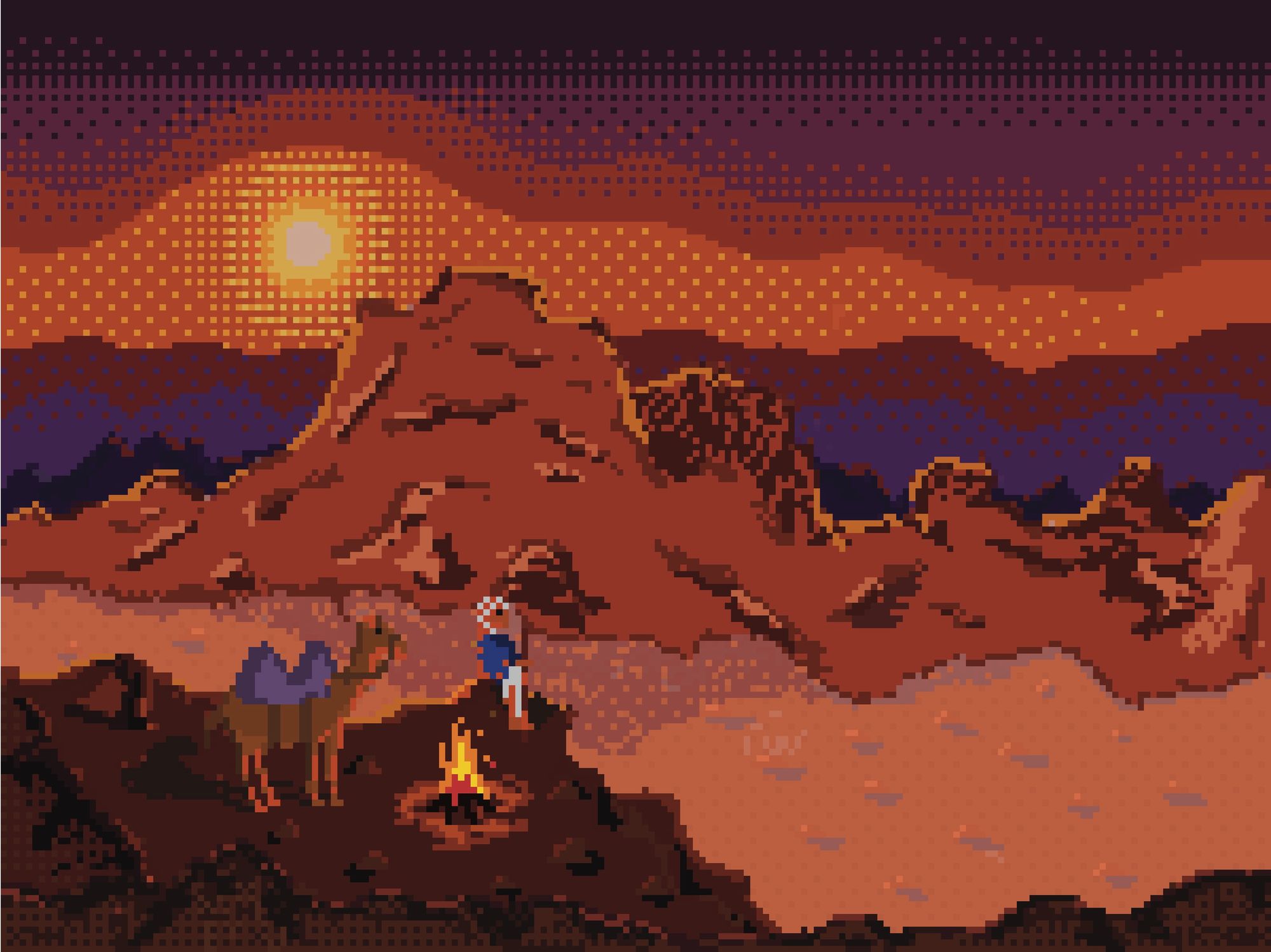 Inspired by my trip to Jordan in 2022 and the awesome desert vistas. The little shadow spots on the bottom right are a herd of camels, but it's a bit tricky to make camels obvious when you have about 4 pixels to use.